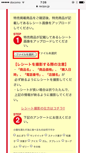 ⑤買ってきたら、早速レシートをアップしましょう。以下の「ファイルを選択」からアップします。