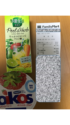 ⑤今回は野菜生活を飲料として買ってみました。(レシートは、実際の提出時はマスキングしていません。)