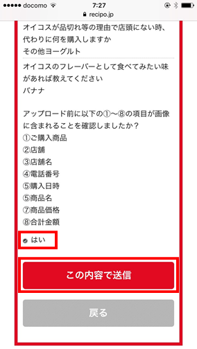 ⑨問題がなければ「はい」を押して、「この内容で送信」を押します。